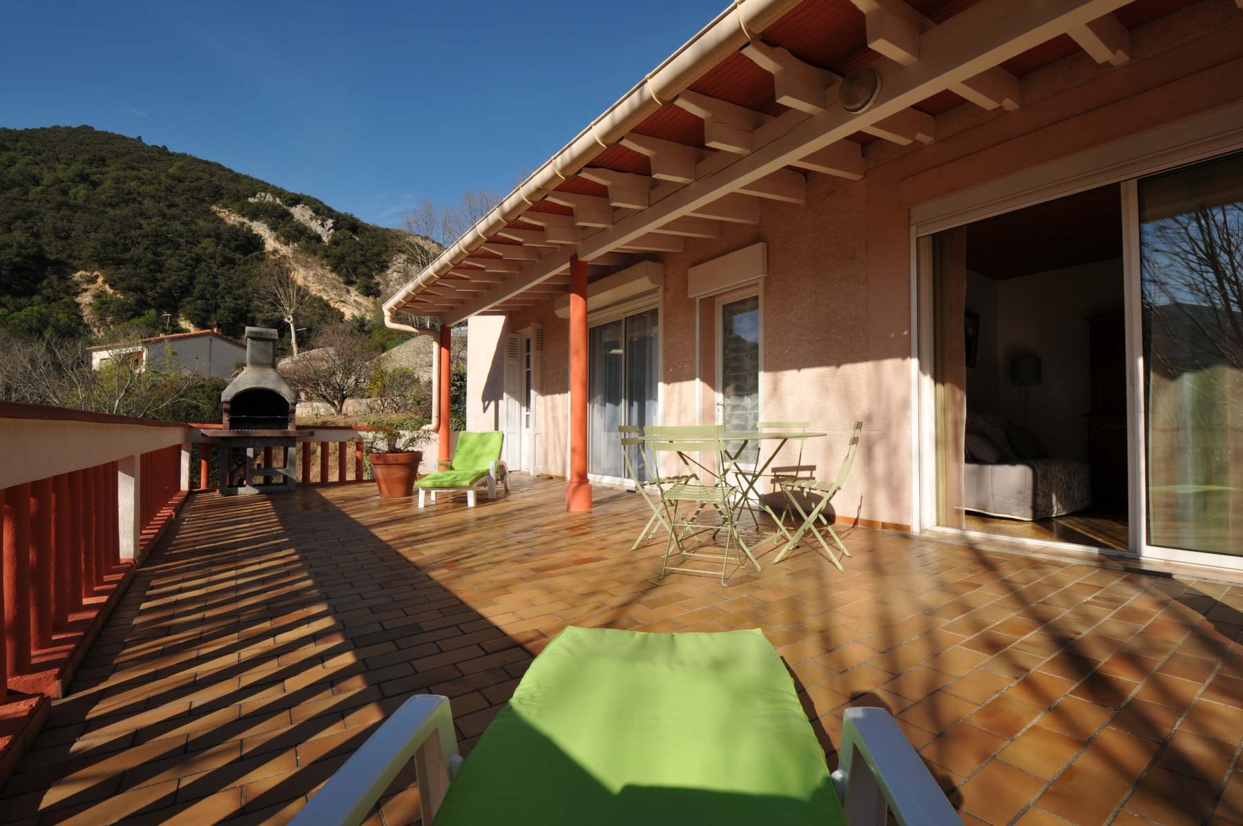 Terrasse d’une superficie de 60 m2 avec salon de jardin, bains de soleil, barbecue