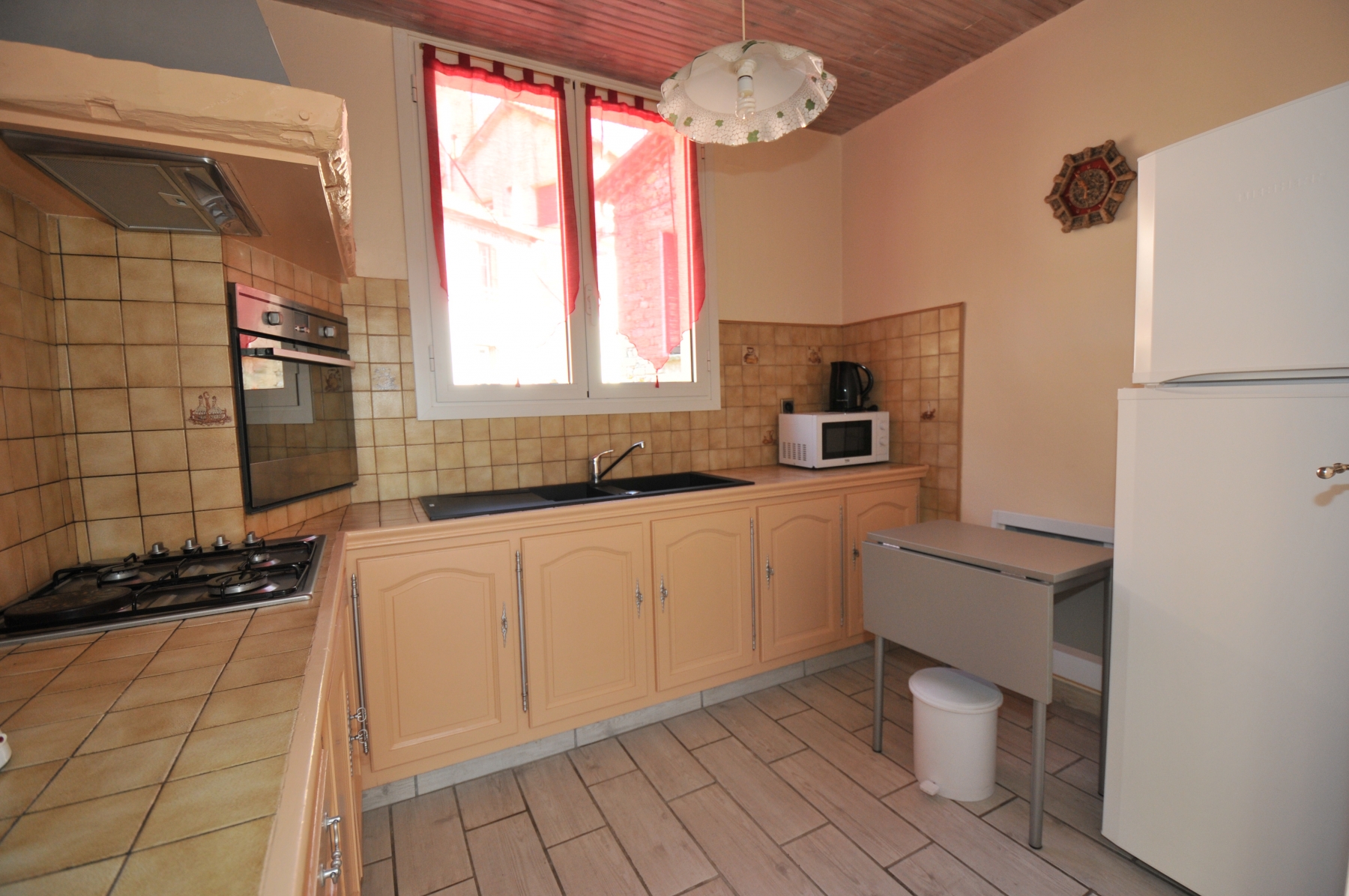 Cuisine équipée, meuble de rangement,plaque de cuisson 4 feux,hotte,four,micro ondes,frigo congélateur,cafetière,grille pain,mixeur, bouilloire et tous les ustensiles à la vie courante de tous les jours, lave linge et étendoir privatif,fer à repasser avec sa table, Aspirateur, télévision grand écran plat